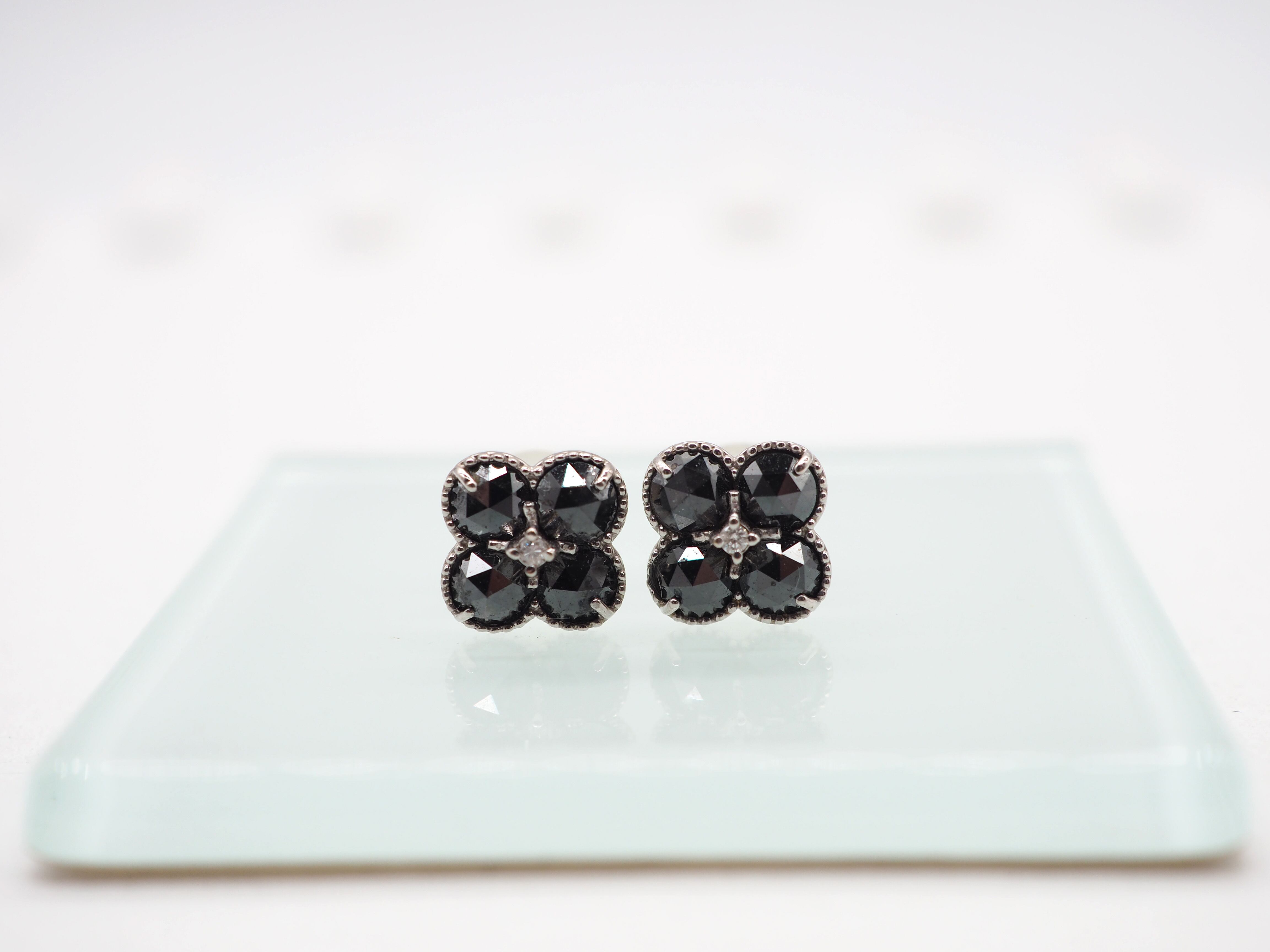 神秘的な黒色が魅力的なブラックダイヤを使用したK18WGピアス!優れた輝きが、洗練された大人の女性の耳元を引き立てます。シンプルながらも花柄デザインで、可愛らしさもプラス。日常使いから特別なシーンまで幅広くお楽しみいただけるアイテムです。