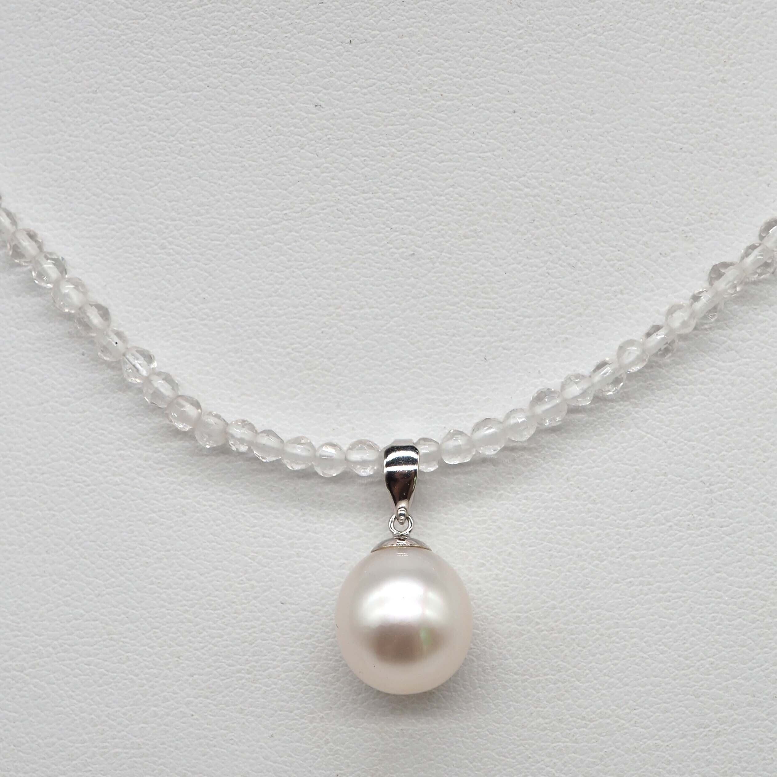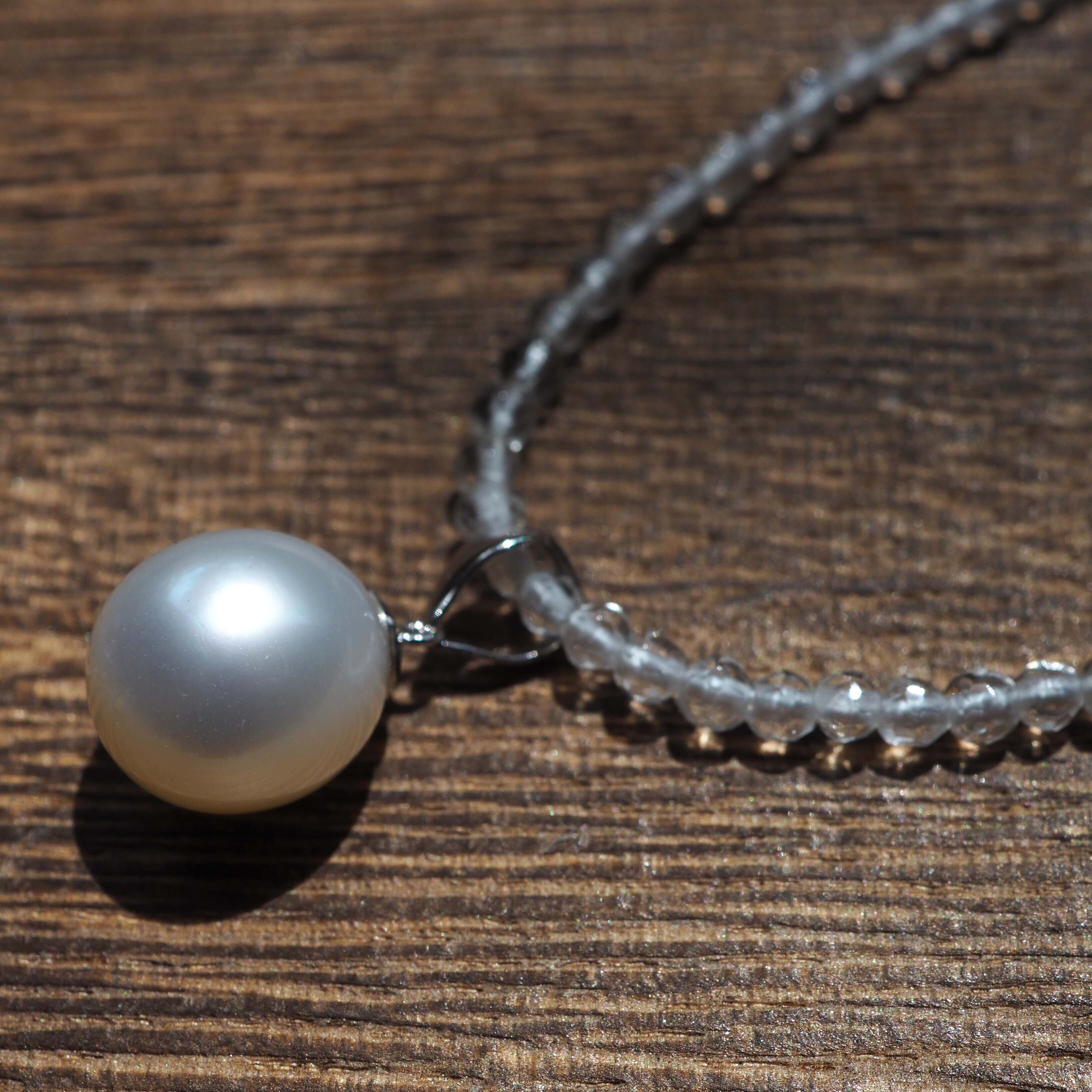 照りと透明感のある白さが特徴的な南洋パールのペンダントネックレスです。南洋パールの輝きと水晶ネックレスの透明感ある組み合わせがなんともたまらん……な商品です。
